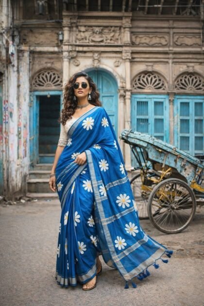 Blue Color Linen Hand Painted Saree