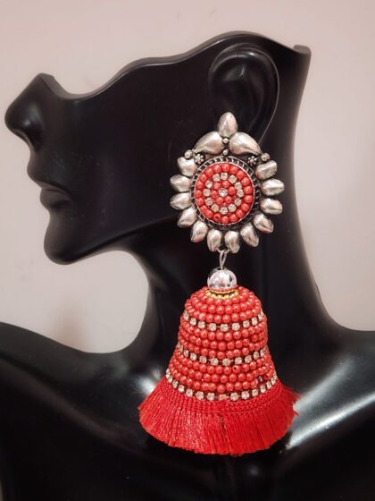 Red Beaded Tussel German Silver Jhumka