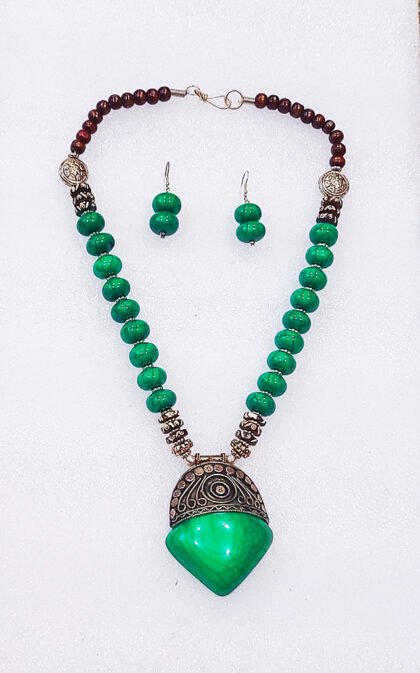 Forest Green Wonderful Classy Stone Beads Necklace Set with Pendulum Pendant