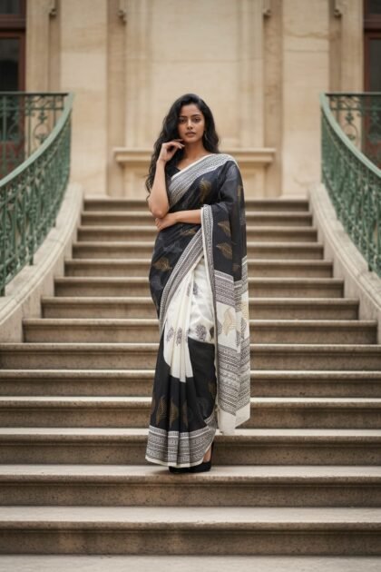 Black & White Block Printed Art Silk Saree
