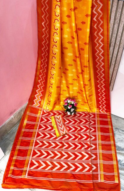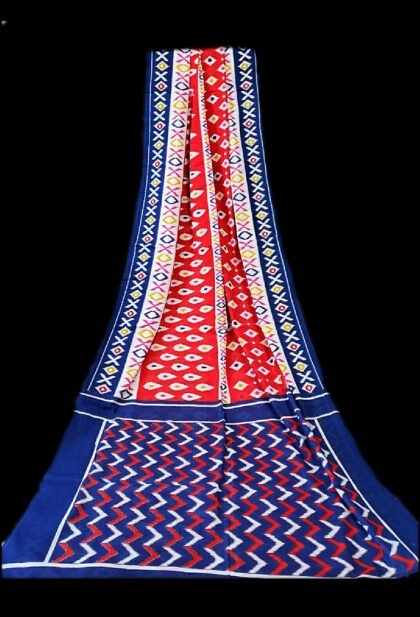 Crimson Red & Blue Color Cotton Ikkat Printed Saree