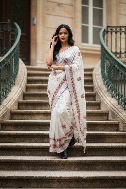 Off-White & Red Color Bapta Tussar Saree
