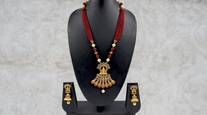 Gold Polish Necklace Set With Stones & Pearl Beads.