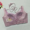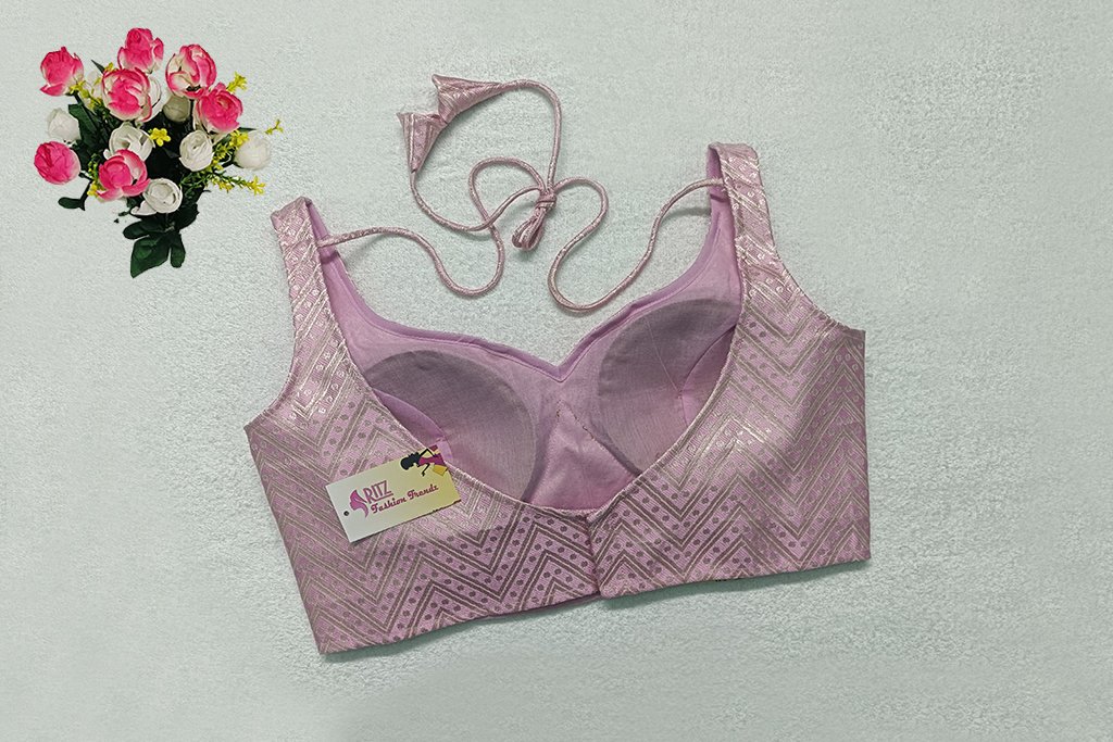 This is a Baby Pink Color Brocade Blouse. This is Sweetheart-Neckline in Frontside & Leaf Neckline in Backside with Tie-Up. This is a Princess Cut, Padded, Sleeveless Blouse with Back Open. You can team it up with any contrast-colored Traditional/Printed Saree.