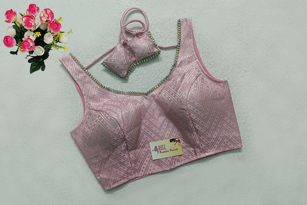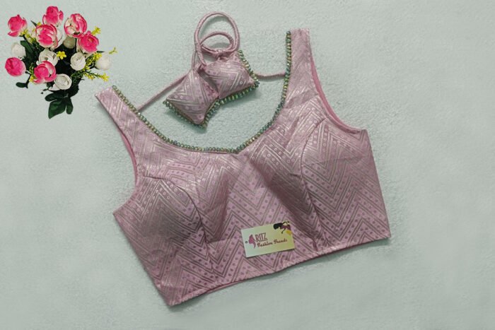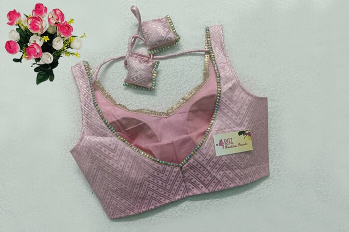 This is a Baby Pink Color Brocade Blouse. This is a Leaf Neckline Blouse in both Frontside & Backside with Tie-Up. This is a Princess Cut, Padded, Sleeveless Blouse with Back Open. You can team it up with any contrast-colored Traditional/Printed Saree.