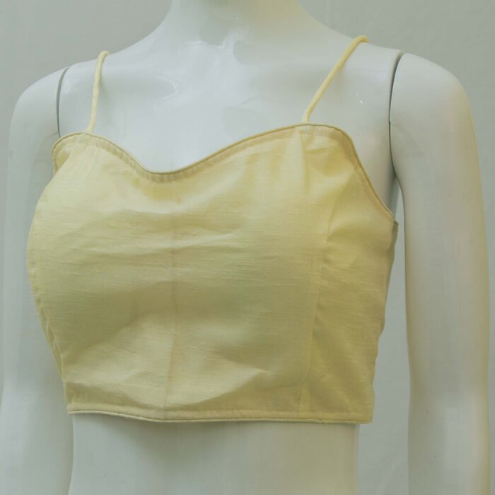 This is a Light Yellow Color Raw Silk Spaghetti. It is Single Spaghetti Strap with Semi Sweetheart Neckline in Frontside & Band Neckline in Backside. It is a Princess Cut and Padded Blouse with Back Open. You can team it up with any contrast colored saree.
