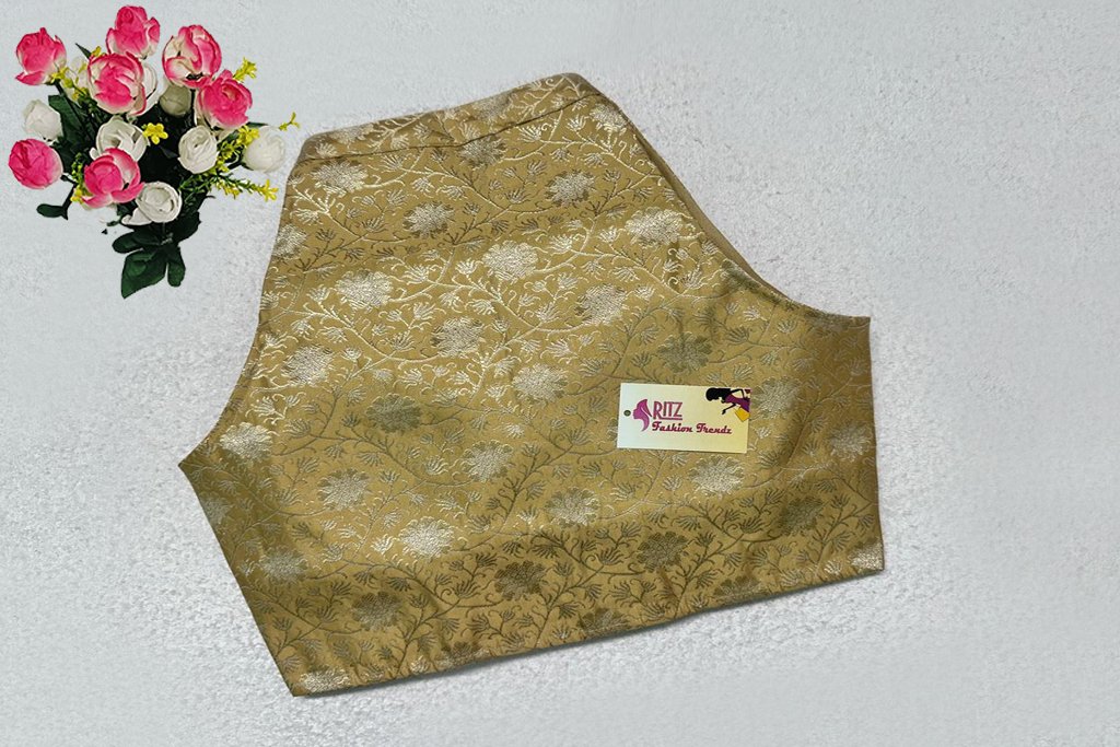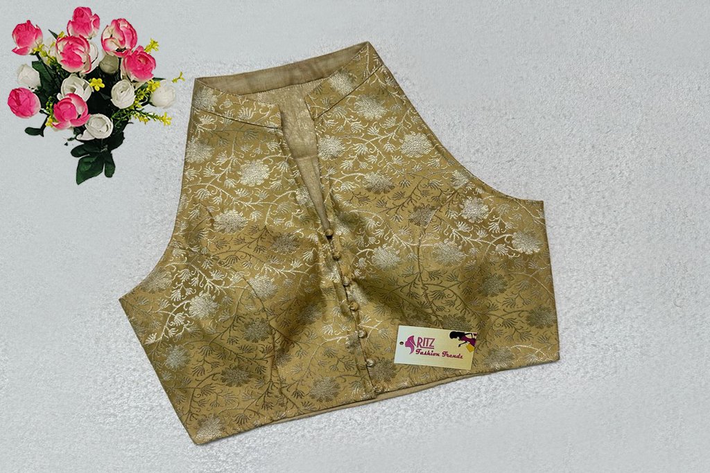 This is a Golden Color Brocade Blouse. This is Halter Neckline in Frontside & High Neckline in Backside with Mandarin Collar. This is a Princess Cut, Padded, Sleeveless Blouse with Front Open. You can team it up with any contrast-colored Traditional/Printed Saree.