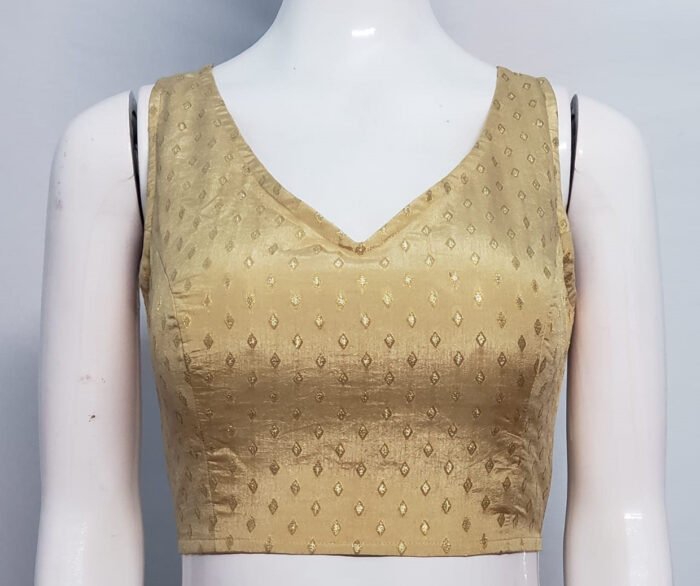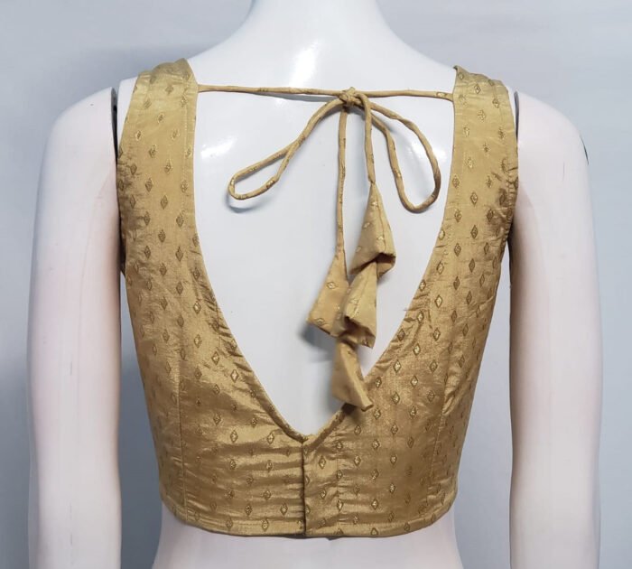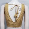 This is a Golden Color Chanderi Silk Blouse. This Blouse is V- Neckline in Frontside and Backside with Tie-Up. This is a Princess Cut, Padded & Sleeveless Blouse with Back Open. You can team it up with any contrast colored Printed or Traditional Saree.