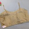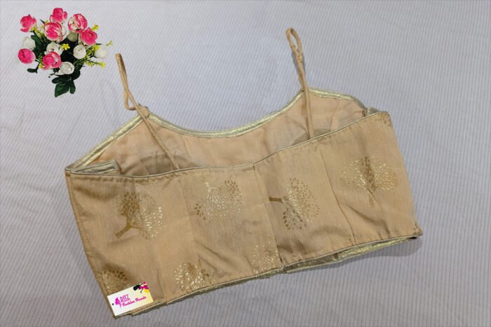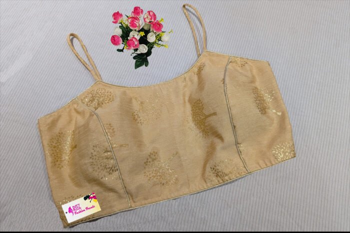 This is a Beige Color Raw Silk with Foil Print. It is Round Neckline in Frontside and Band Neckline in Backside. This is a Princess Cut, Padded, Spaghetti Blouse with Back Open. You can team it up with any contrast colored Printed/Traditional Saree.
