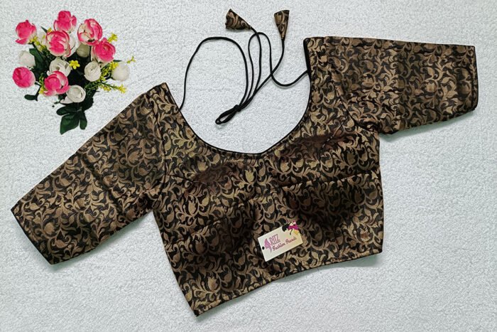 This is a Black Color Brocade Benarasi Blouse. This Blouse is Leaf Neckline in Frontside & Backside with Tie-Up. This is a Princess Cut, Padded, Glass Sleeve Blouse with Back Open. You can team it up with any contrast-colored Traditional/Printed Saree.