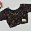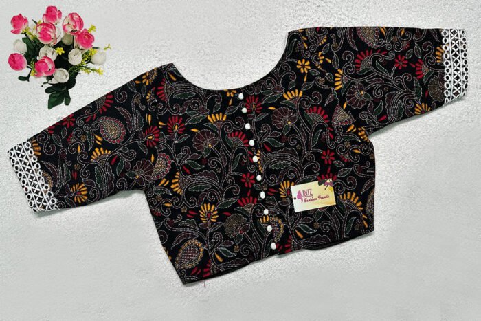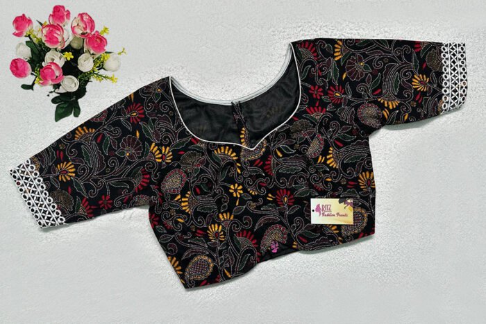 This is a Black Multi Color Cotton Printed Blouse. This is a Sweetheart Neckline Blouse in Frontside & Boat Neckline in Backside. This is a Princess Cut, Non-Padded, Glass Sleeve Blouse with Back Open. You can team it up with any contrast-colored Traditional/Printed Saree.