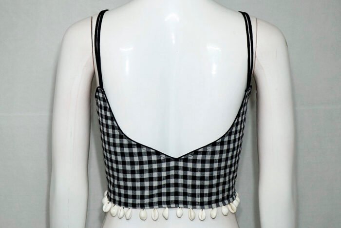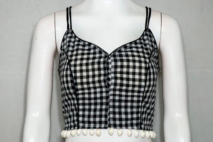 This is a Black & White Color Cotton Gamcha Print with Double Strap Spaghetti. This Blouse is Sweet Heart Neckline in Frontside and Leaf Neckline in Backside with Kari Work. This is a Princess Cut Padded Blouse with Double Spaghetti Strap and Front Open. You can team it up with any contrast colored Traditional Saree.