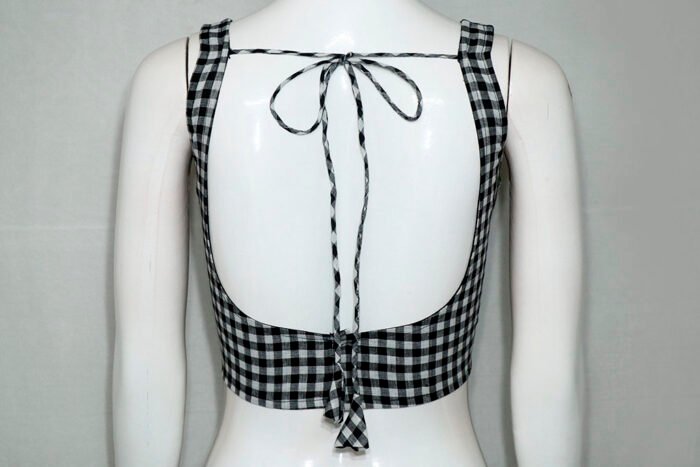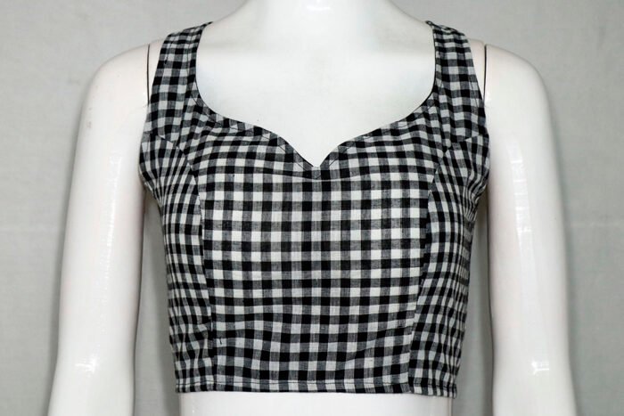 This is a Black & White Color Cotton Gamcha Print Blouse. This Blouse is Sweet Heart Neckline in Frontside and U-Neckline in Backside with Tie-Up. This is a Princess Cut Sleeveless Padded Blouse with Back Open. You can team it up with any contrast colored Printed/Traditional Saree.