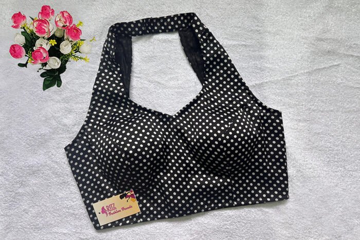 This is a Black & White Color Satin Printed Blouse. It is Double Strap Halter Neckline in both Frontside and Backside with Mandarin Collar. This is a Princess Cut Padded Blouse. This Blouse is Sleeveless and Back Open. You can team it up with any contrast colored Printed/Traditional Saree.