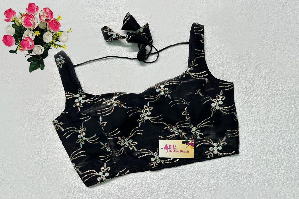 This is a Black Color Jimmy Choo Embroidered Blouse. This is Semi-Sweetheart Neckline in Frontside & U-Neckline in Backside with Tie-Up. This is a Princess Cut, Padded, Sleeveless Blouse with Back Open. You can team it up with any contrast-colored Traditional/Printed Saree.