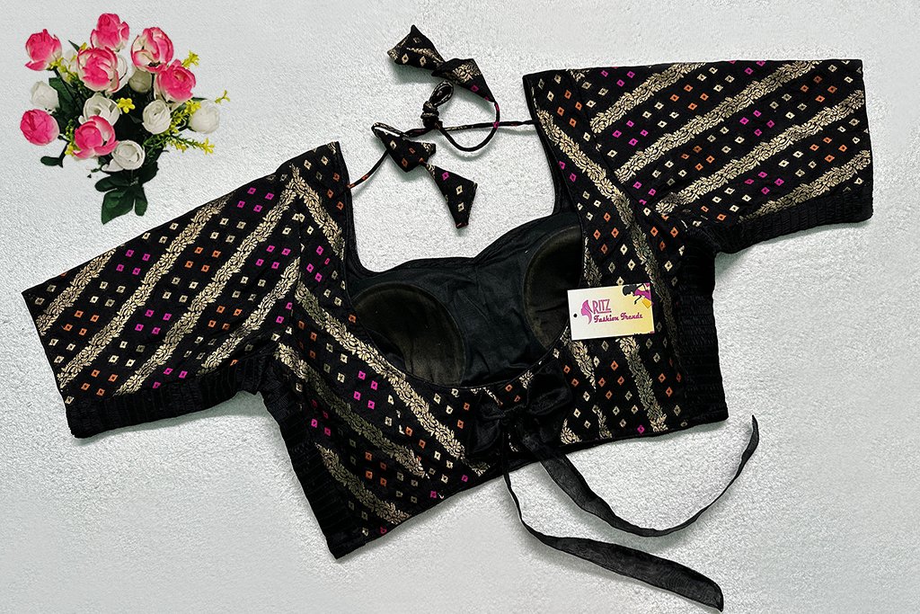 This is a Black Color Meena Kari Elastic Ease Blouse. This is Sweetheart Neckline in Frontside & Backside with a Bow. This is a Princess Cut, Padded, Sleeveless Blouse with Back Open. You can team it up with any contrast-colored Traditional/Printed Saree.