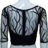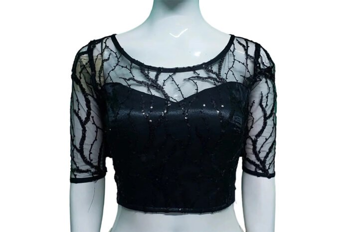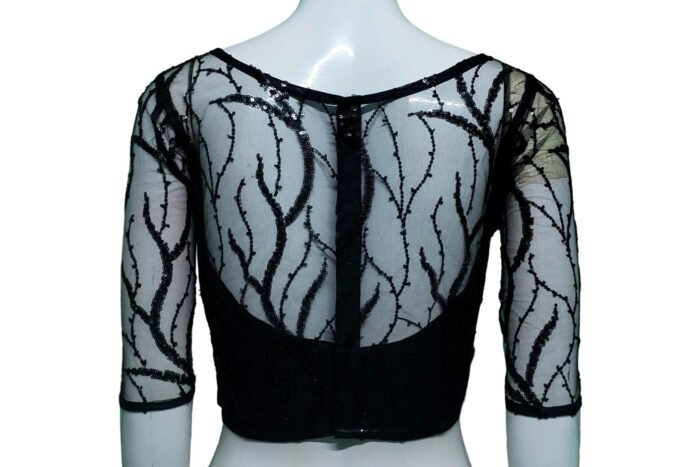 This is a Black Color Sequin Net Blouse. This Blouse is Illusion Boat Neckline in Frontside and Boat Neckline in Backside. This is a Princess Cut, Padded, Sleeveless Blouse with Backside Open. You can team it up with any contrast colored Printed or Traditional Saree.