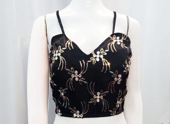 This is a Black Color Organza Embroidered Spaghetti. This Blouse is V-Neckline in Frontside & Band Neckline in Backside. This is a Princess Cut, Padded Blouse. This Blouse is Spaghetti Sleeves and Back Open. You can team it up with any contrast-colored Traditional/Printed Saree.