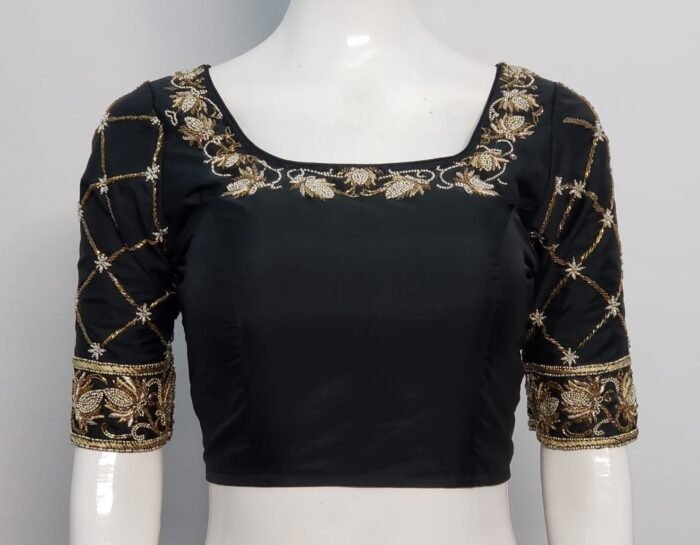 This is a Black Color Hand Embroidered Samo Silk Blouse. It is a Square Neckline in Frontside and Backside. This is a Princess Cut Padded Glass Sleeve Blouse with Back Open. You can team it up with any contrast-colored Traditional Saree. We assure the authenticity and quality of our products.