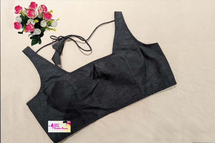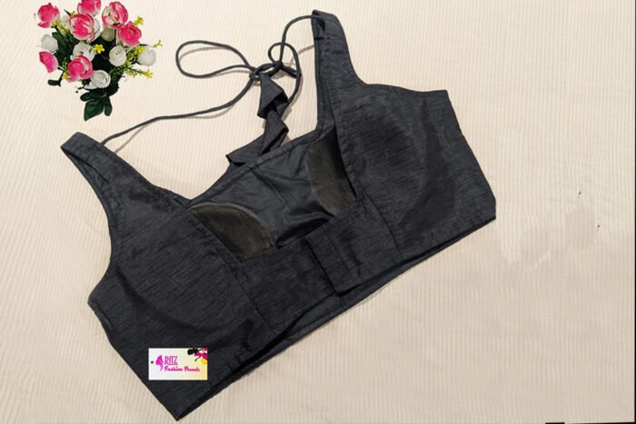 This is a Black Color Raw Silk Blouse. It is Square Neckline in both Frontside and Backside with Tie-Up. This is a Princess Cut, Padded, Sleeveless Blouse with Back Open. You can team it up with any contrast colored Printed/Traditional Saree.