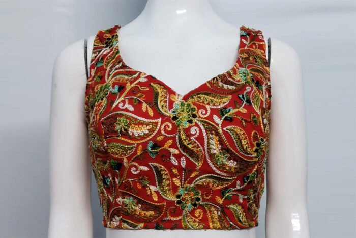 This is a Red Multi Color Georgette Embroidered Blouse. This Blouse is Sweetheart Neckline in Frontside and Leaf Neckline in Backside with Tie Up. This is a Princess Cut, Padded & Sleeveless Blouse with Back Open. You can team it up with any contrast colored Printed or Traditional Saree.
