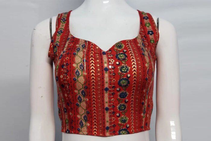 This is a Red Multi Color Rayon Blouse. This Blouse is Sweetheart Neckline in Frontside and Keyhole Neckline in Backside with Tie Up. This is a Princess Cut, Padded & Sleeveless Blouse with Back Open. You can team it up with any contrast colored Printed or Traditional Saree.