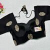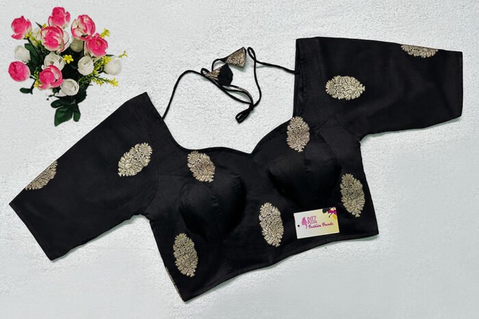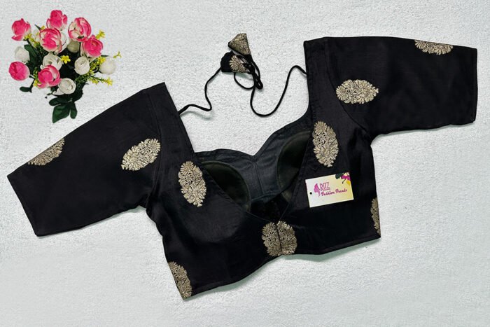 This is a Black Color Russian Silk Blouse. This is Sweetheart Neckline in Frontside & Leaf Neckline in Backside with Tie-Up. This is a Princess Cut, Padded, Glass Sleeve Blouse with Back Open. You can team it up with any contrast-colored Traditional/Printed Saree.