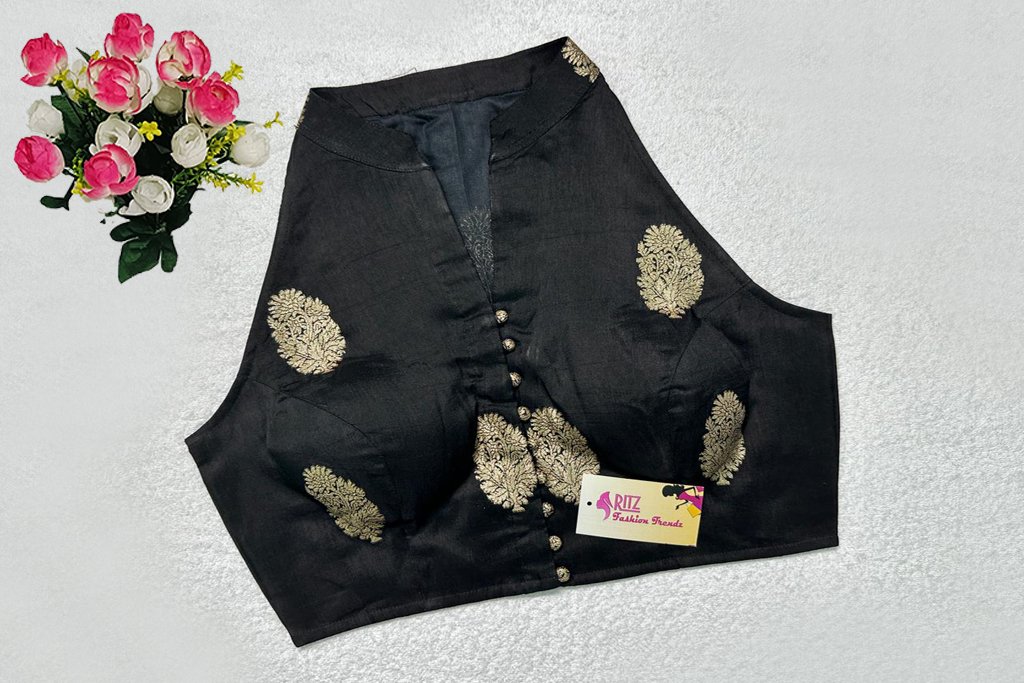 This is a Black Color Russian Silk Blouse. This is Halter Neckline in Frontside & High Neckline in Backside with Mandarin Collar. This is a Princess Cut, Padded, Sleeveless Blouse with Front Open. You can team it up with any contrast-colored Traditional/Printed Saree.