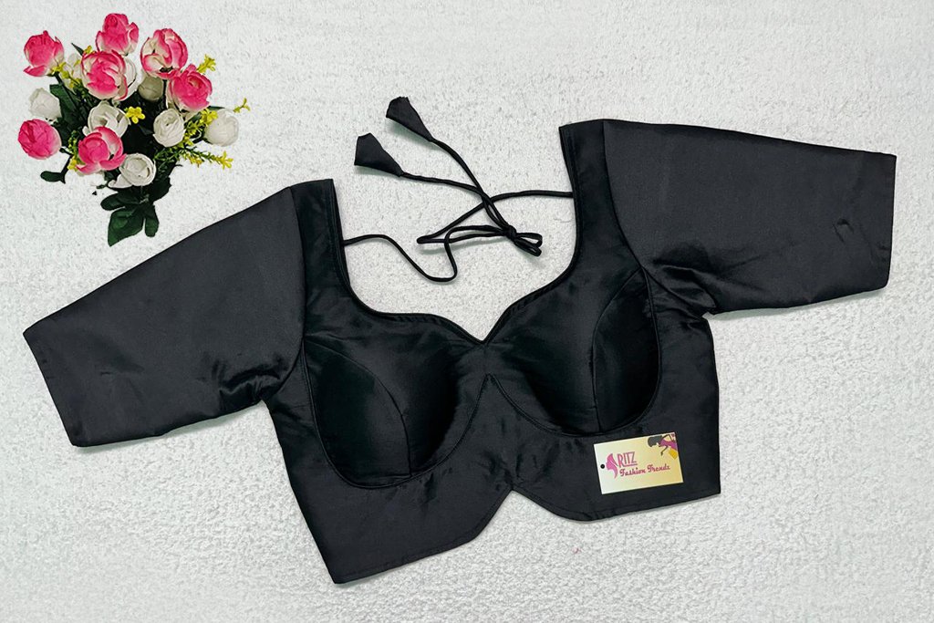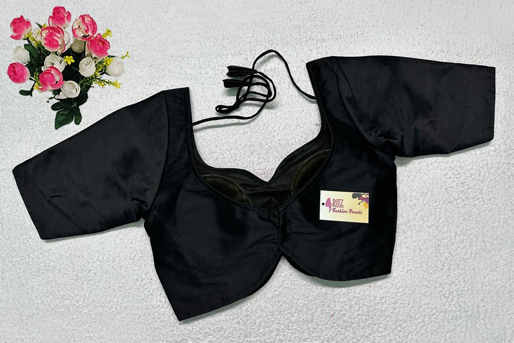 This is a Black Color Samo Silk Blouse. This is Sweetheart Neckline in Frontside and Leaf Neckline in Backside with Tie-Up. This is a Princess Cut, Padded, Glass Sleeve Blouse with Back Open. You can team it up with any contrast-colored Traditional/Printed Saree.