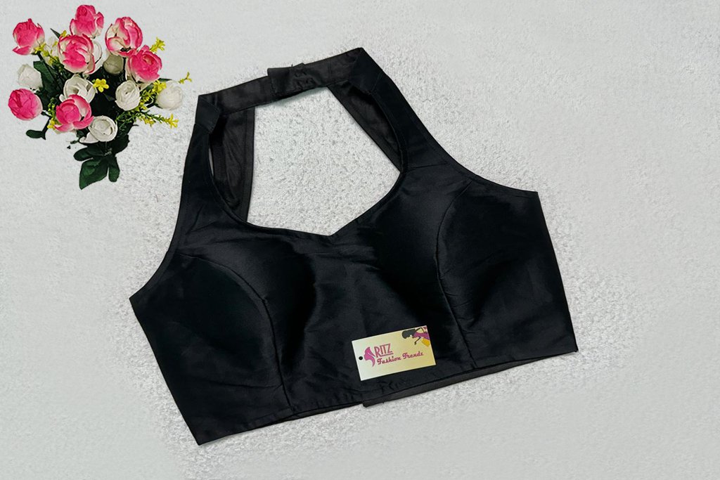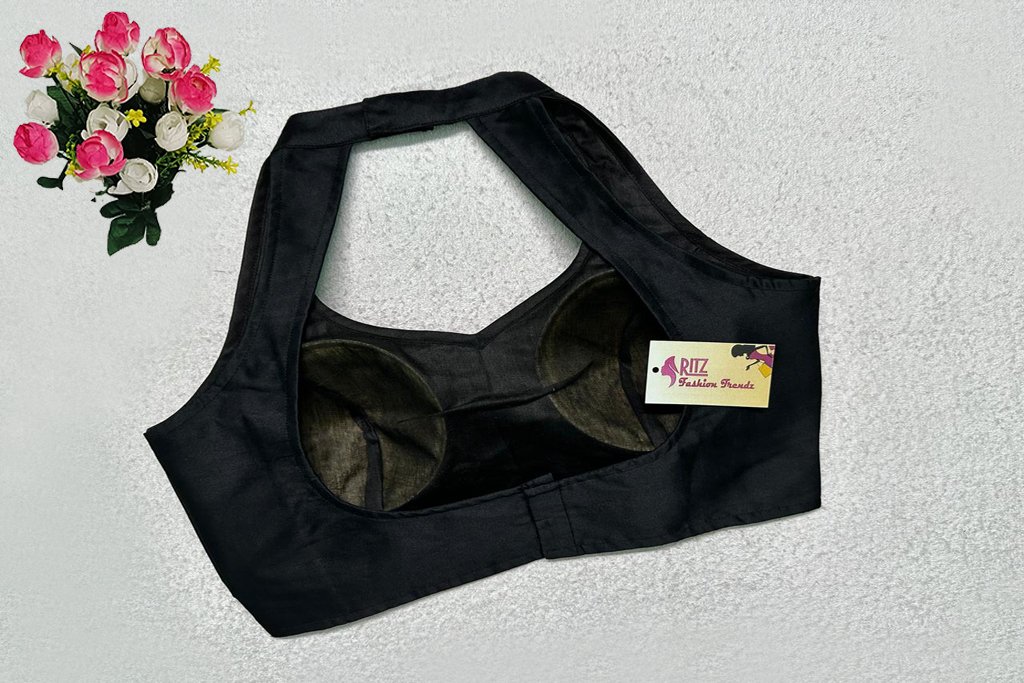 This is a Black Color Samo Silk Blouse. This is Double Strap Halter Neckline in both Frontside & Backside with Mandarin Collar. This is a Princess Cut, Padded, Sleeveless Blouse with Back Open. You can team it up with any contrast-colored Traditional/Printed Saree.