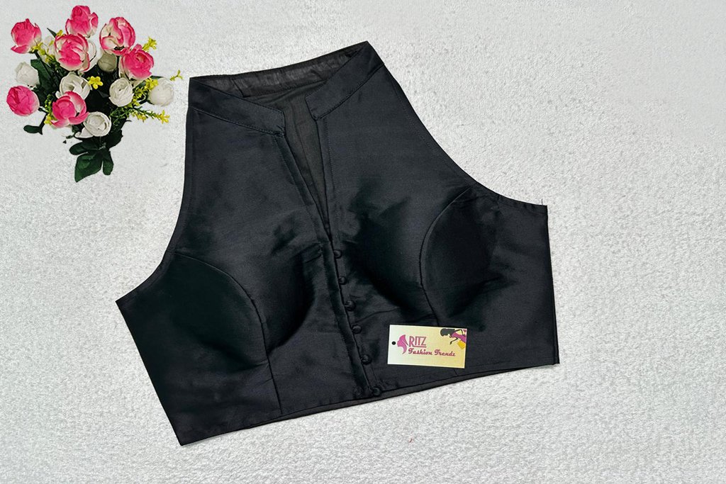 This is a Black Color Samo Silk Blouse. This is Halter Neckline in Frontside & High Neckline in Backside with Mandarin Collar. This is a Princess Cut, Padded, Sleeveless Blouse with Front Open. You can team it up with any contrast-colored Traditional/Printed Saree.