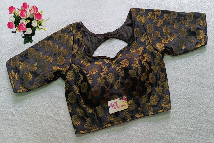 This is a Black Color Satin Benarasi Blouse. This Blouse is Sweetheart Neckline in Frontside & Keyhole Neckline in Backside. This is a Princess Cut, Padded, Glass Sleeve Blouse with Back Open. You can team it up with any contrast-colored Traditional/Printed Saree.