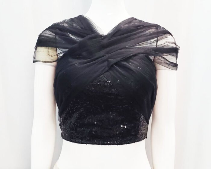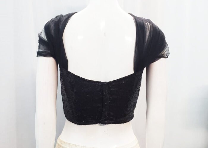 This is a Black Color Net with Sequin Blouse. This Blouse is V-Cut Neckline in Frontside & U-Cut Neckline in Backside. This is a Princess Cut, Padded Blouse. This Blouse is Off-Shoulder with Back Open. You can team it up with any contrast-colored Traditional/Fancy Saree.
