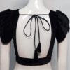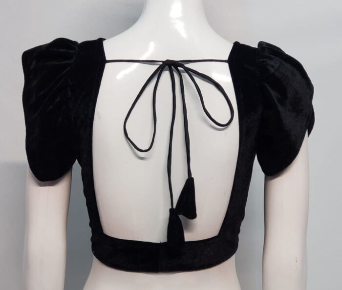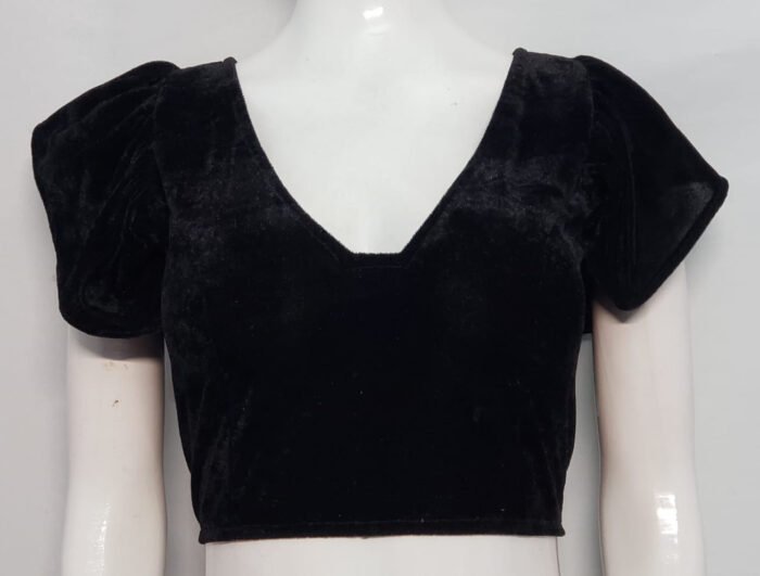 This is a Black Color Velvet Blouse. This Blouse is V-Neckline in Frontside and Square Neckline in Backside with Tie Up. This is a Princess Cut, Padded & Ruffle Sleeve Blouse with Back Open. You can team it up with any contrast colored Printed or Traditional Saree.