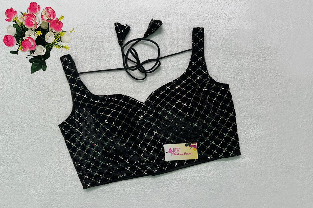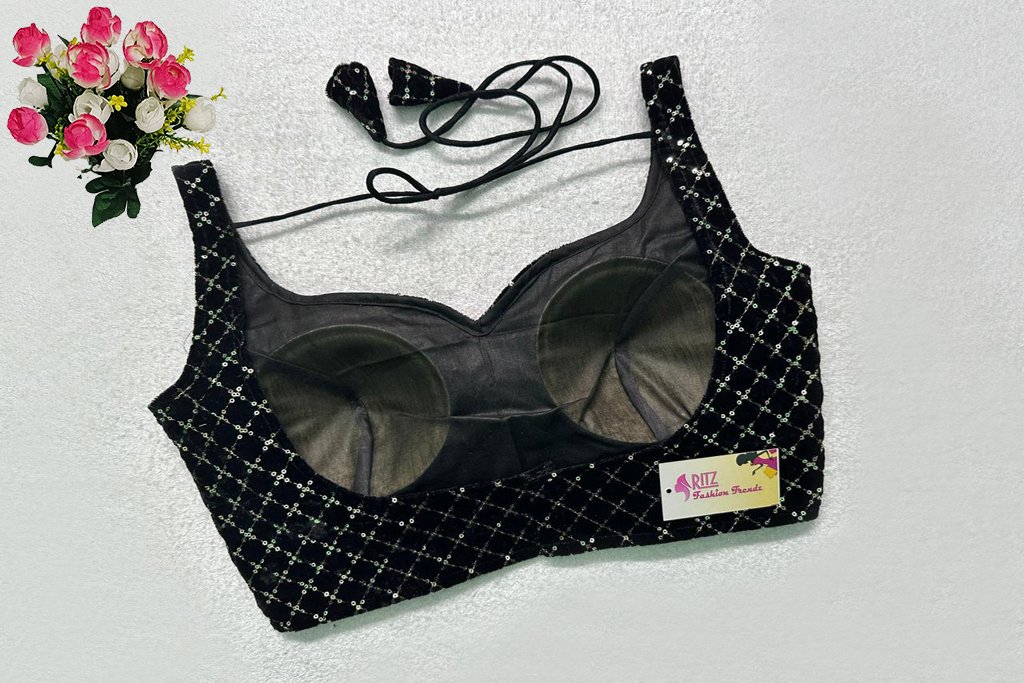This is a Black Color Velvet Embroidered Blouse. This is Sweetheart Neckline in Frontside & U-Neckline in Backside with Tie-Up. This is a Princess Cut, Padded, Sleeveless Blouse with Back Open. You can team it up with any contrast-colored Traditional/Printed Saree.