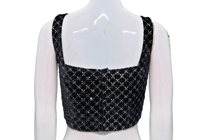 This is a Black Color Velvet Embroidered Blouse. This Blouse is Illusion Square Neckline in Frontside and Band Neckline in Backside. This is a Princess Cut, Padded, Sleeveless Blouse with Back Open. You can team it up with any contrast colored Printed or Traditional Saree.