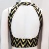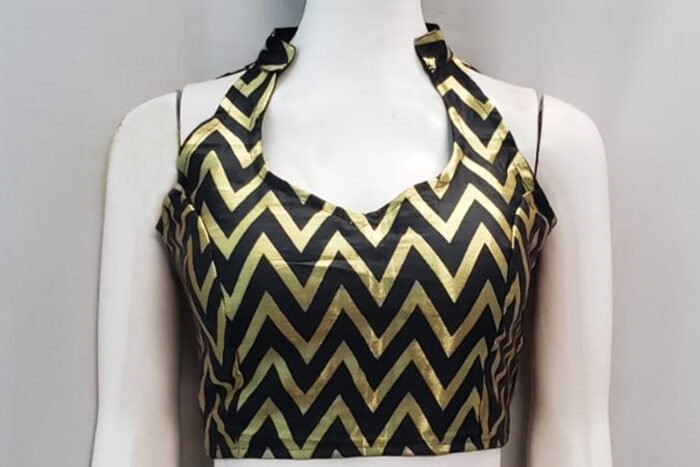 This is a Black Color Brocade Blouse. This Blouse is Double Strap Halter Arrow Neckline in Frontside & Backside with Mandarin Collar. This is a Princess Cut, Padded, Sleeveless Blouse with Front Open. You can team it up with any contrast-colored Traditional/Fancy Saree.