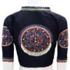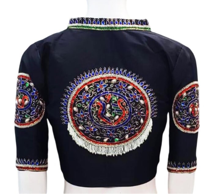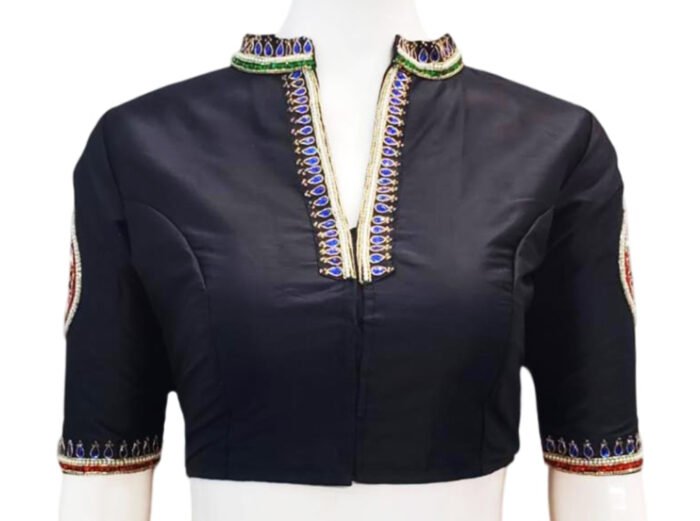 This is a Black Color Samo Silk Hand Work Blouse. This Blouse is V-Neckline in Frontside & High-Neckline in Backside with Mandarin Collar. This is a Princess Cut, Non-Padded, Glass Sleeve Blouse with Front Open. You can team it up with any contrast-colored Traditional/Fancy Saree.