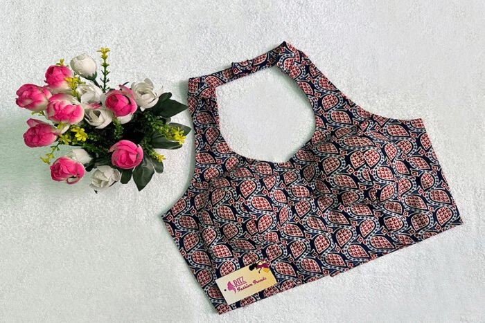 This is a Navy Blue Multi Color Cotton Printed Blouse. This Blouse is Double Strap Halter Neckline in both Frontside & Backside with Mandarin Collar. This is a Princess Cut, Padded, Sleeveless Blouse with Back Open. You can team it up with any contrast-colored Traditional/Printed Saree.