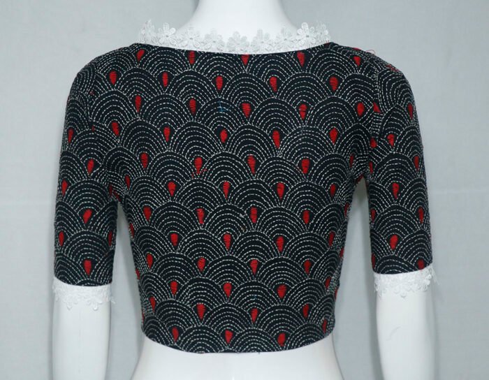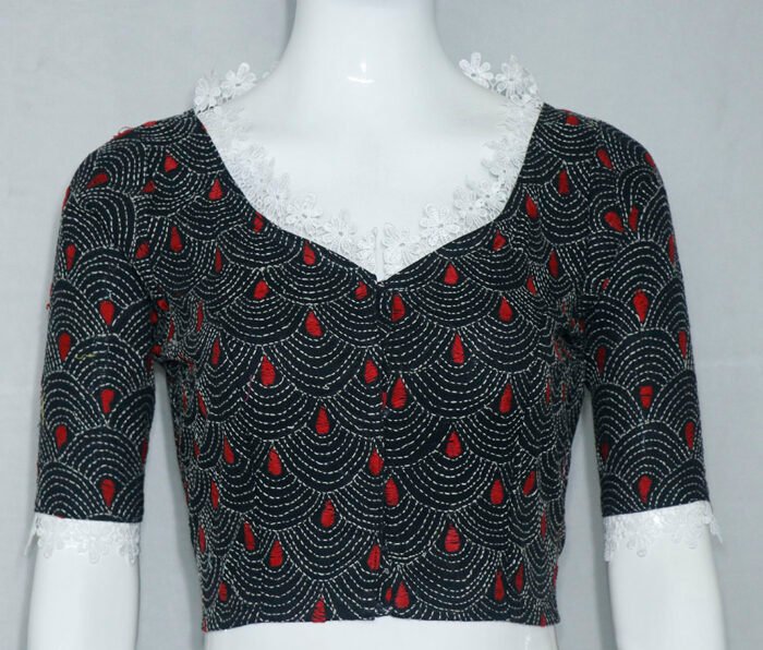 This is a Black Color Cotton Kantha Stitch Blouse. This Blouse is Sweetheart Neckline in Frontside and High Neckline in Backside. This Blouse is Lace Embroidered in Sleeves and Necklines. This is a Princess Cut Glass Sleeve Non Padded Blouse with Front Open. You can team it up with any contrast colored Traditional Saree.
