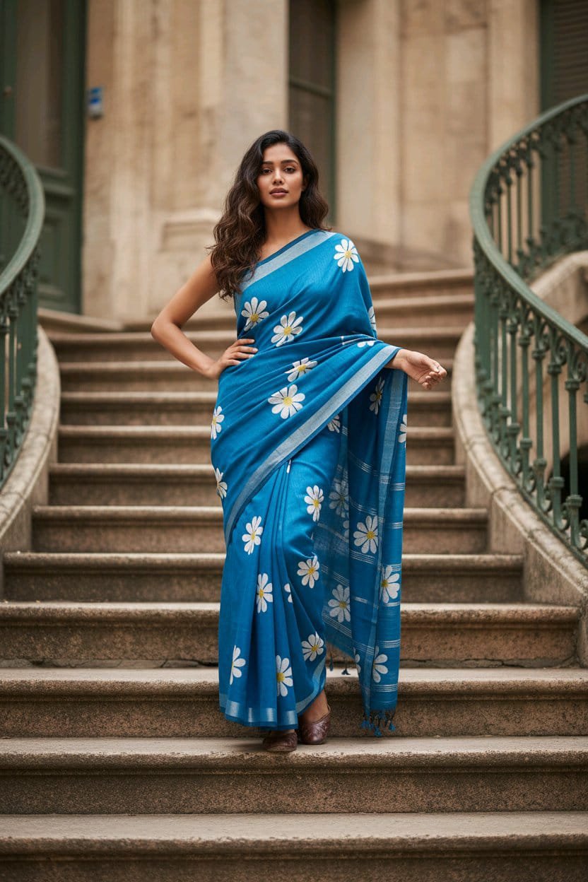 Blue Color Linen Hand Painted Saree.