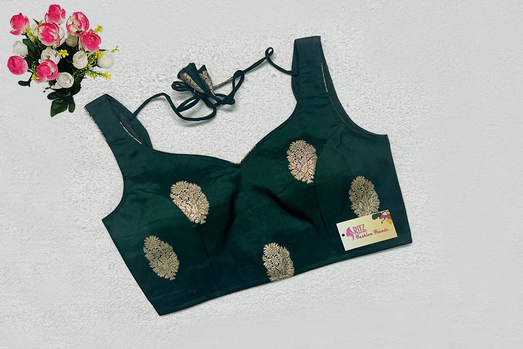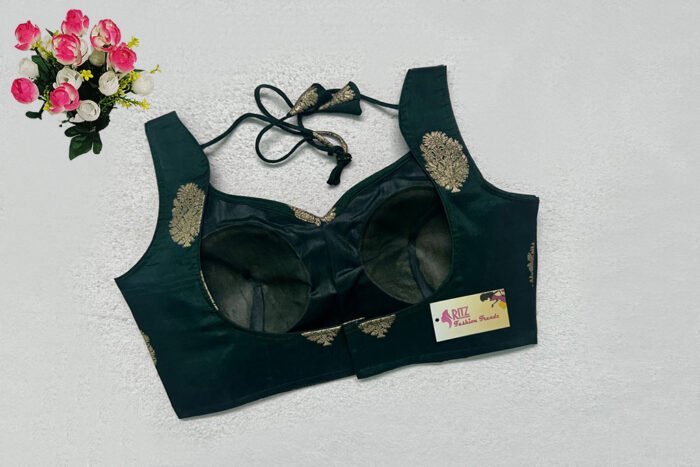 This is a Bottle Green Color Russian Silk Blouse. This is a Sweetheart Neckline Blouse in Frontside & U-Neckline in Backside with Tie-Up. This is a Princess Cut, Padded, Sleeveless Blouse with Back Open. You can team it up with any contrast-colored Traditional/Printed Saree.