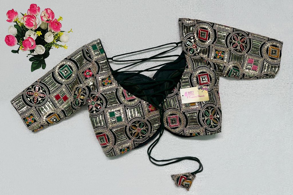 This is a Bottle Green Multi Color Georgette Embroidered Blouse. This is Sweetheart Neckline in Frontside & Leaf Neckline in Backside with Tie-Up. This is a Princess Cut, Padded, Glass Sleeve Blouse with Front Open. You can team it up with any contrast-colored Traditional/Printed Saree.