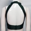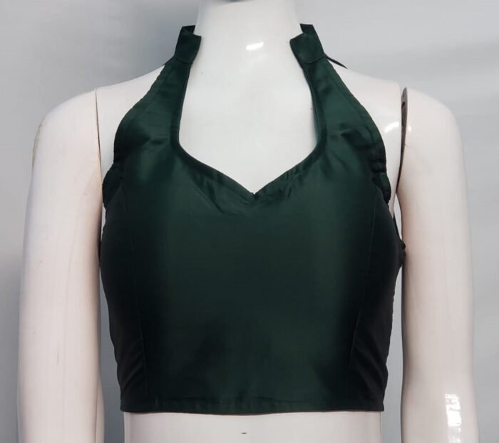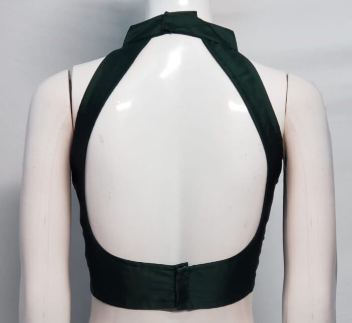 This is a Bottle Green Color Samo Silk Blouse. This Blouse is Halter Arrow Neckline in Frontside and Backside with Mandarin Collar. This is a Princess Cut, Padded, Sleeveless Blouse with Back open. You can team it up with any contrast colored Printed or Traditional Saree.