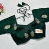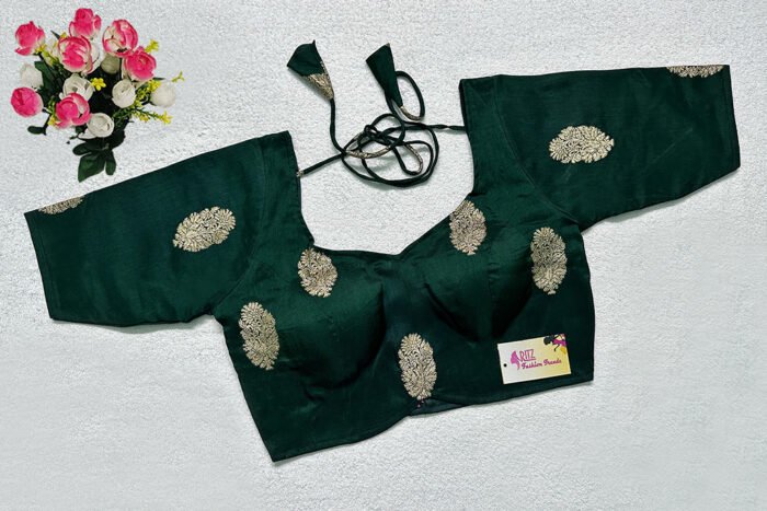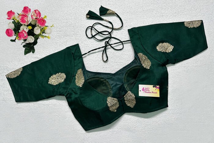 This is a Bottle Green Color Russian Silk Blouse. This is Semi Sweetheart Neckline in both Frontside & Backside with Tie-Up. This is a Princess Cut, Padded, Glass Sleeve Blouse with Back Open. You can team it up with any contrast-colored Traditional/Printed Saree.