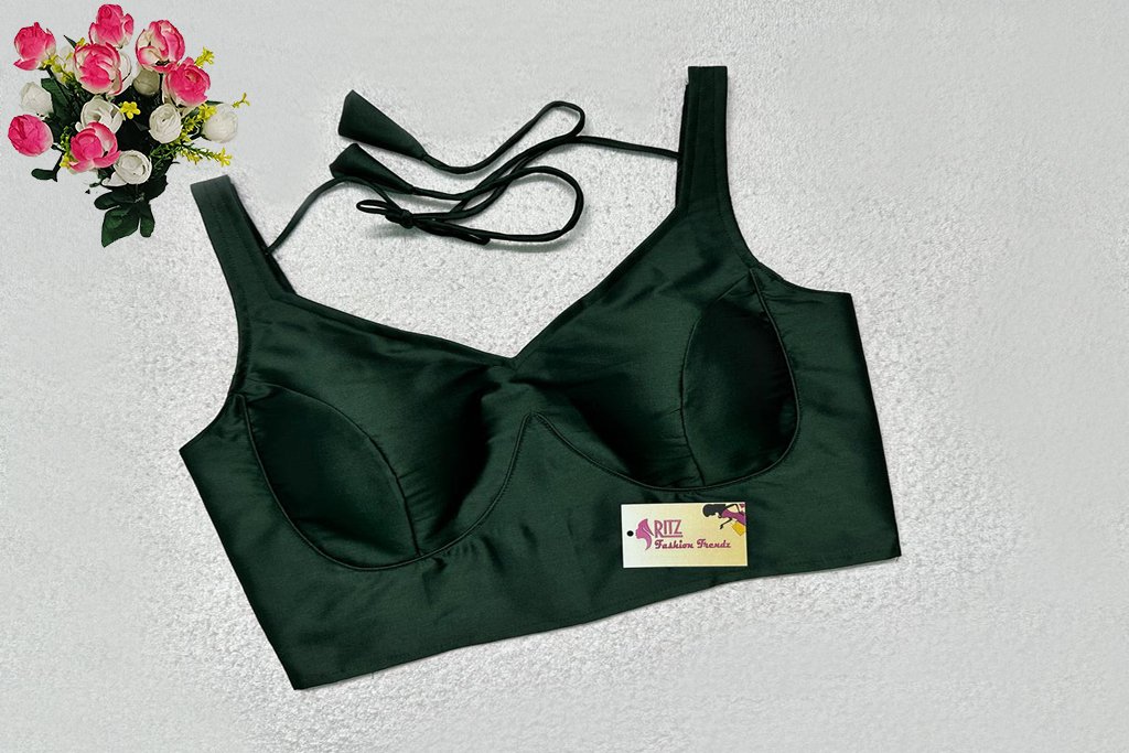 This is a Bottle Green Color Samo Silk Blouse. This is V-Neckline in Frontside & Band Neckline in Backside with Tie-Up. This is a Princess Cut, Padded, Sleeveless Blouse with Back Open. You can team it up with any contrast-colored Traditional/Printed Saree.
