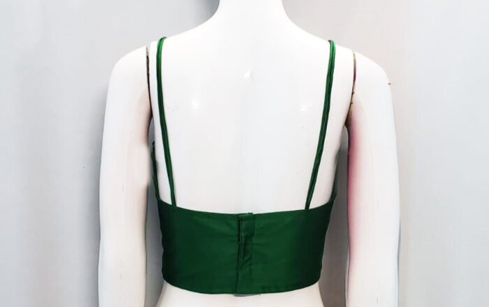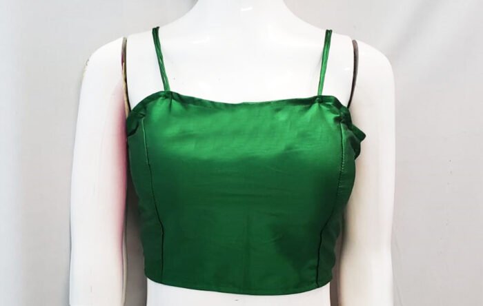 This is an Emerald Green Color Samo Silk. This Blouse is Semi-V Neckline in Frontside & Band in Backside. This is a Princess Cut, Padded, Spaghetti Blouse with Back Open. You can team it up with any contrast-colored Traditional/Fancy Saree.