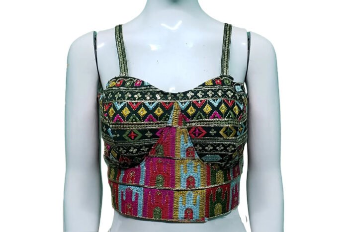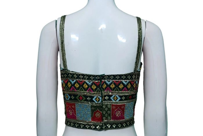 This is a Bottle Green Multi Color Georgette Heavy Embroidered Spaghetti. This Blouse is Semi- Sweetheart Neckline in Frontside and Band Neckline in Backside. This is a Princess Cut, Padded, Single Strap Spaghetti Blouse with Back Open. You can team it up with any contrast colored Printed or Traditional Saree.
