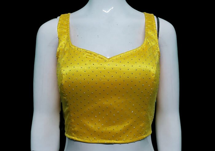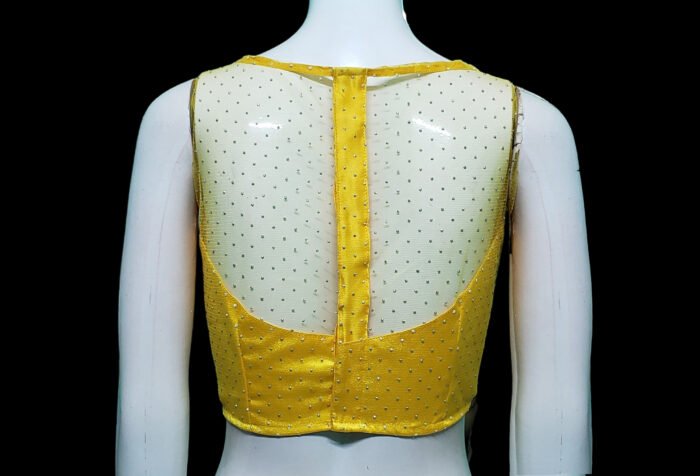 This is a Yellow Color Glitter Net Blouse. This Blouse is Sweet Heart Neckline in Frontside and Illusion High Neckline in Backside. This is a Princess Cut, Padded, Sleeveless Blouse with Back Open. You can team it up with any contrast colored Printed or Traditional Saree.