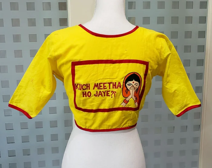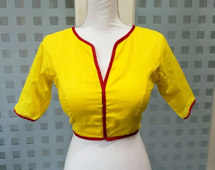 This Blouse comes in Yellow Color Pure Rubia with Multi Color Hand Painting on Backside. This Blouse is Princess Cut Padded Glass Sleeve Blouse. This is Round High Neckline in Frontside and Backside. It is Front Open. You can team it up with any contrast colored saree.